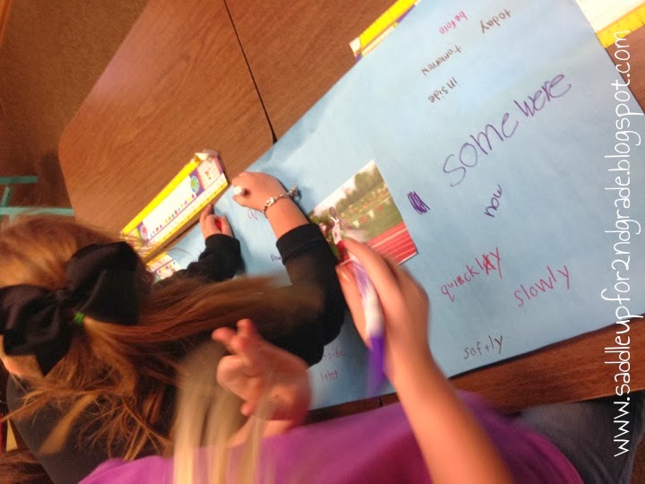 After reviewing these for a few days, some of my kiddos just weren’t getting it. Of course, Amy from Step into Second Grade came to my rescue! She blogged about making adjective posters. I loved the idea so I decided to use them for adverbs instead. I printed out 4 verb pictures (eat, write, run, and sleep) and glued them onto butcher paper. I split my kids up into groups and had them rotate to each one. They had to write adverbs that described each picture. Was it perfect? No! Was every word spelled correctly? No! Was it effective? YES!!! This just seemed to click with my strugglers. They used the anchor chart posted above to help guide them. I didn’t hear one conversation that didn’t have to do with adverbs. It was fantastic!
