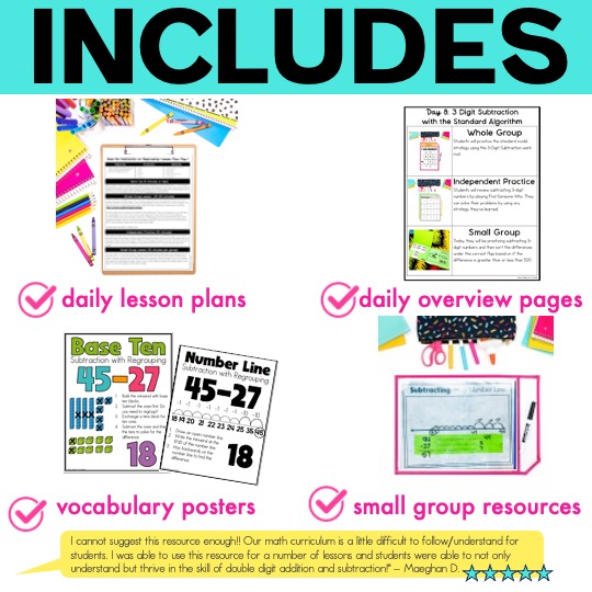 These lesson plans for 2 and 3 digit subtraction with regrouping consist of 10 days of activities and are formatted in a guided math structure, featuring daily math warm-ups, whole-group mini-lessons, independent practice, and small-group classroom ideas.